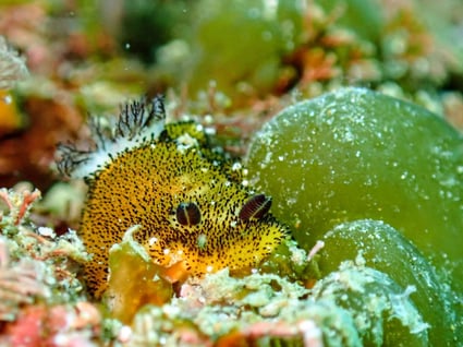 水温が14~16℃と幅広くなってきて、楽しみにしていたウミウシが増えてきた海中です。 白崎海域では白色のゴマフビロードウミウシが多く見られる中、今回は黄色バージョンを見ることができました。